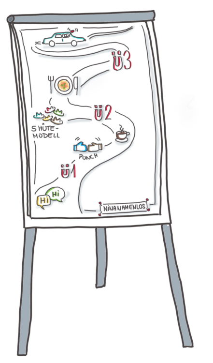 Das kann bedeuten, dass Du am Ende doch noch selber zeichnen willst (damit es DEIN Stil ist). Es kann auch Ergebnis sein, dass Du weniger Flipcharts brauchst. Weil wir Teile der Präsentation im Sinne der Abwechslung für die Teilnehmenden mutig ganz anders anders präsentieren (von mir bekommst Du da sehr kreative und begeisternde Ideen und Impulse!).